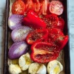 - Step 1: Preheat the oven to 200 °C (390 °F). Place the quartered tomatoes, red bell pepper, red and white onions, and halved garlic head (cut side up) on a parchment-lined baking tray. Drizzle with 3 tablespoons olive oil and sprinkle with oregano, thyme, chili flakes, salt, and pepper. Roast for 30–35 minutes until the vegetables are soft and caramelized at the edges.