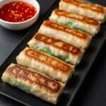 - Cook Egg Rolls – Stovetop Shallow Frying Method: Heat 0.5 tablespoon oil in a large 12-inch non-stick pan over medium heat until shimmering. Add egg rolls carefully, avoiding overcrowding. Shallow fry for 2 minutes per side, flipping every 2 minutes. Continue flipping and rotating for about 10 minutes total to prevent burning and sticking. Provide plenty of space between rolls during frying.