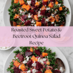 A vibrant and nutritious roasted sweet potato and beetroot salad featuring quinoa, kale, pecans, raisins, and tangy feta cheese, all tossed in a zesty apple cider vinegar and lemon dressing. Perfect as a healthy lunch or a light dinner, this salad blends earthy roasted vegetables with fresh greens and bursts of sweet and savory flavors.