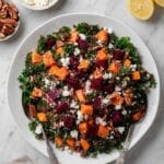 A vibrant and nutritious roasted sweet potato and beetroot salad featuring quinoa, kale, pecans, raisins, and tangy feta cheese, all tossed in a zesty apple cider vinegar and lemon dressing. Perfect as a healthy lunch or a light dinner, this salad blends earthy roasted vegetables with fresh greens and bursts of sweet and savory flavors.