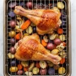- Serve: Transfer the turkey legs and roasted vegetables to serving plates. Drizzle with the pan juices for added moisture and flavor. For extra indulgence, use the pan drippings to make a simple two-ingredient turkey gravy to pour over the meal. Enjoy immediately.