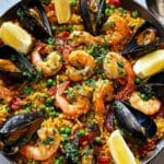 This vibrant Seafood Paella combines succulent shrimp and mussels with fragrant saffron rice, simmered to perfection in a flavorful broth. A classic Spanish dish, this paella features a delightful mix of smoky paprika, garlic, and fresh vegetables, creating a satisfying one-pan meal with a traditional socarrat crust.