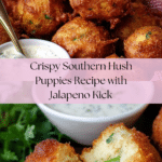 Southern hush puppies are crispy, golden fried cornmeal balls packed with a mild spicy kick from jalapenos and a touch of sweetness. Perfect as a side for fried fish or barbecue, they bring a comforting Southern charm to any table.