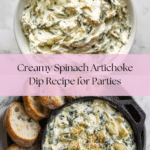 A creamy and cheesy Spinach Artichoke Dip that is perfect for parties and gatherings. This baked dip combines cream cheese, mayo, sour cream, parmesan, mozzarella, spinach, and artichokes, baked until bubbly and golden, served warm with crusty bread or crackers.