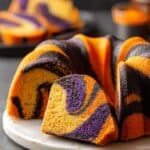 Celebrate Halloween with this Spooky Swirl Halloween Bundt Cake featuring vibrant neon orange, purple, and black swirls. This moist and fluffy cake combines classic vanilla and almond flavors with a hint of orange zest, creating a striking and delicious centerpiece perfect for festive gatherings.