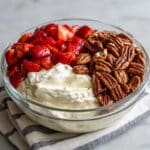 - Assemble the Salad: Just before serving, spread the cream cheese mixture evenly in a serving dish or bowl. Layer the sliced strawberries on top, then sprinkle the cooled pretzel crunch mixture over the strawberries. Optionally, you can mix some pretzel crunch into the cream layer or reserve extra pretzel topping for garnish.