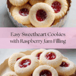 Delightfully tender Sweetheart Cookies featuring a buttery dough filled with sweet raspberry or strawberry preserves. These charming cookies are lightly dusted with confectioners’ sugar, making them perfect for gifting or special occasions.