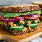 Store the chickpea mixture in an airtight container in the refrigerator for up to 3 days. To prevent soggy bread, assemble the sandwiches just before serving. Leftover assembled sandwiches are best eaten the same day, but can be wrapped tightly and refrigerated for up to 24 hours. Reheat slightly if desired, though this sandwich is often enjoyed cold.