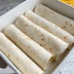 - Assemble Enchiladas: Spoon an even amount of the filling onto the center of each flour tortilla. Roll up the tortillas tightly and place them seam side down into a greased 9”x13” baking dish, arranging them evenly.