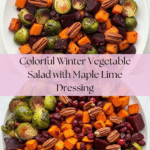Keywords: winter vegetable salad, roasted brussels sprouts, roasted butternut squash, cooked beets, toasted pecans, dried cranberries, maple lime dressing, balsamic glaze, healthy winter salad