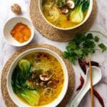 - Season and assemble: Turn off heat and season soup with salt and lime or lemon juice. Stir in cooked bok-choy, mushrooms, and rice noodles.
